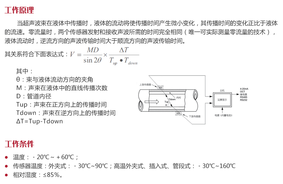 工作原理當(dāng)超聲波束在液體中傳播時(shí),液體的流動(dòng)將使傳播時(shí)間產(chǎn)生微小變化,其傳播時(shí)間的變化正比于液體的流速。零流量時(shí),兩個(gè)傳感器發(fā)射和接收聲波所需的時(shí)間完全相同(唯一可實(shí)際測(cè)量零流量的技術(shù)),液體流動(dòng)時(shí),逆流方向的聲波傳輸時(shí)間大于順流方向的聲波傳輸時(shí)間。