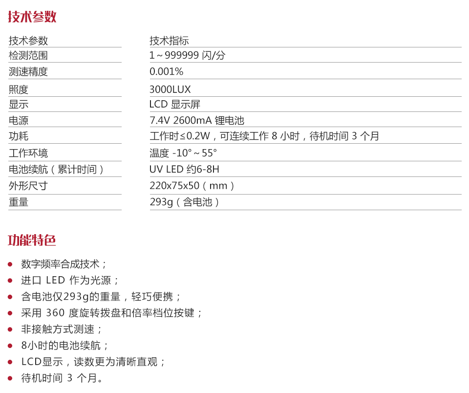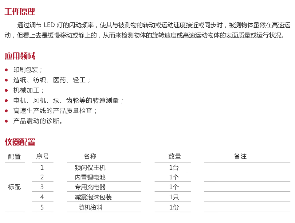 工作原理通過調(diào)節(jié) LED 燈的閃動頻率,使其與被測物的轉(zhuǎn)動或運(yùn)動速度接近或同步時,被測物體雖然在高速運(yùn)動,但看上去是緩慢移動或靜止的,從而來檢測物體的旋轉(zhuǎn)速度或高速運(yùn)動物體的表面質(zhì)量或運(yùn)行狀況。