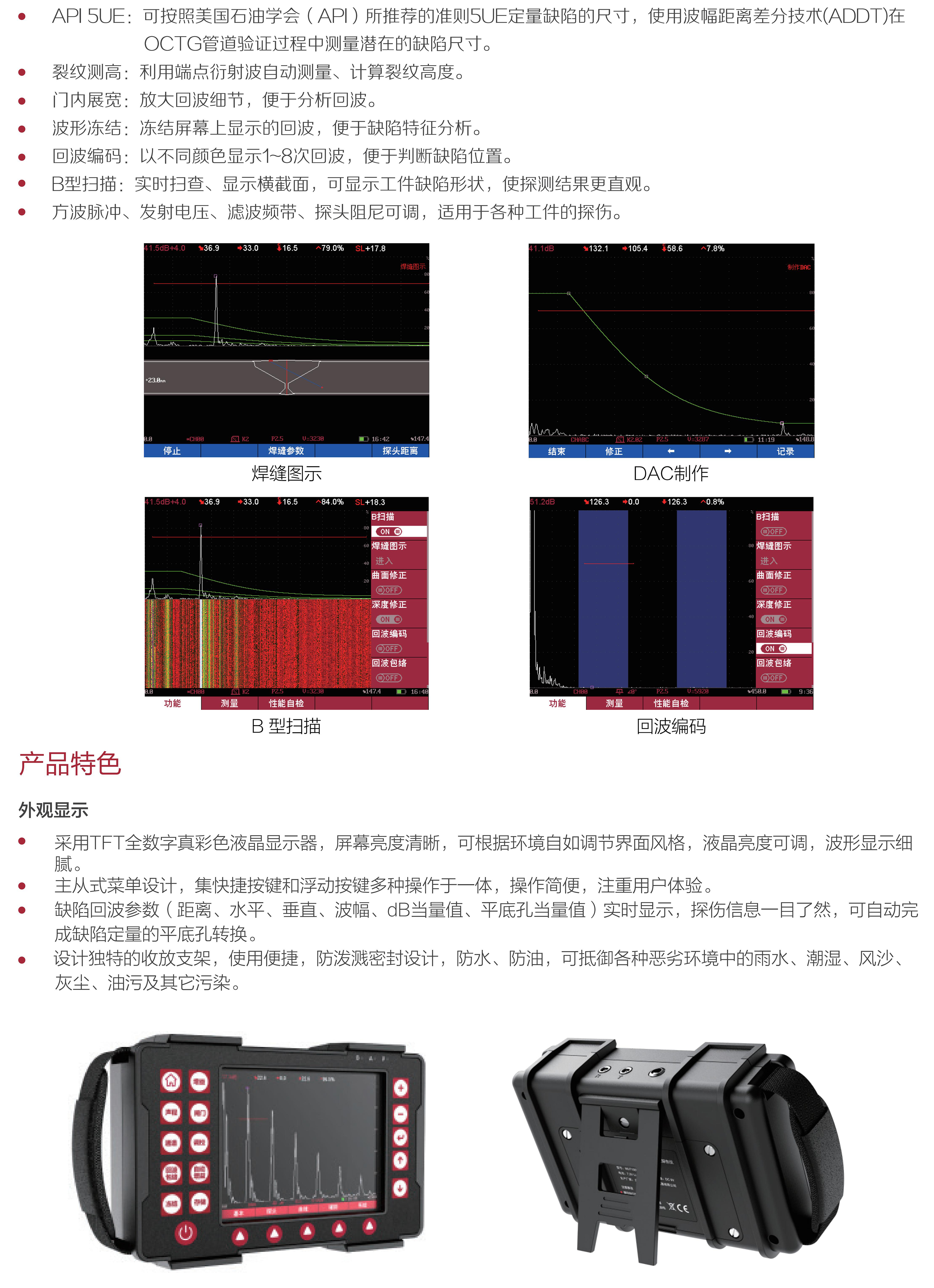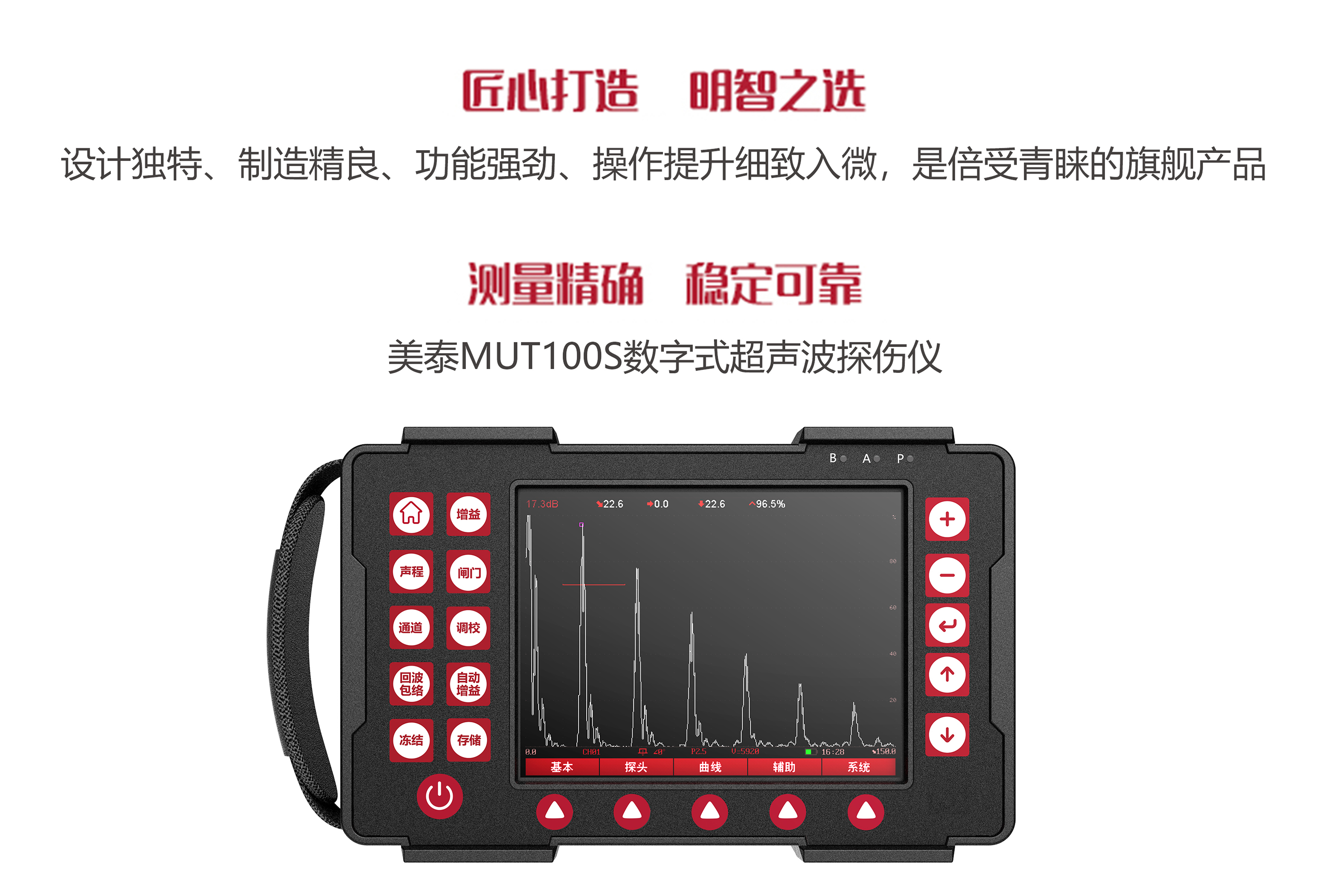 產(chǎn)品概述MUT100S全數(shù)字超聲波探傷儀,輕巧機身、便于攜帶,640×480數(shù)字真彩液晶顯示,支持亮度調(diào)節(jié),全屏顯示設(shè)有多種顏色方案,在不同光線環(huán)境下均可高清呈現(xiàn)缺陷波形,內(nèi)置高頻處理器可實現(xiàn)復雜運算及智能分析,低功耗設(shè)計配備大容量鋰電池模塊,可超長待機8.5小時以上。主從式菜單設(shè)計,支持多語言版本。全防水、油、塵可達IP65防護級。它是石油、化工、冶金、造船、航空、鐵路等領(lǐng)域缺陷檢測、質(zhì)量控制、在役安全監(jiān)測與壽命評估必備的專業(yè)精密儀器。