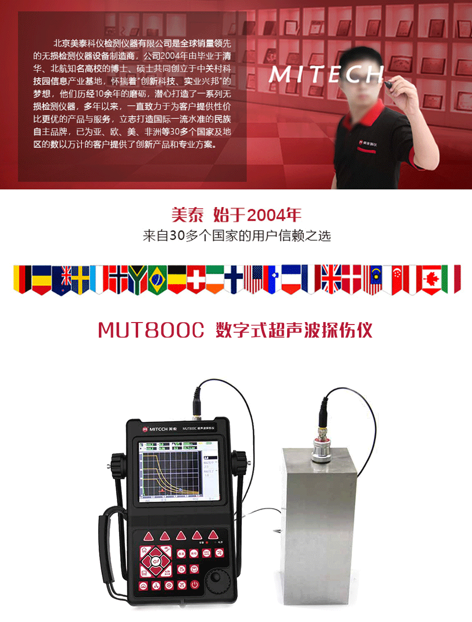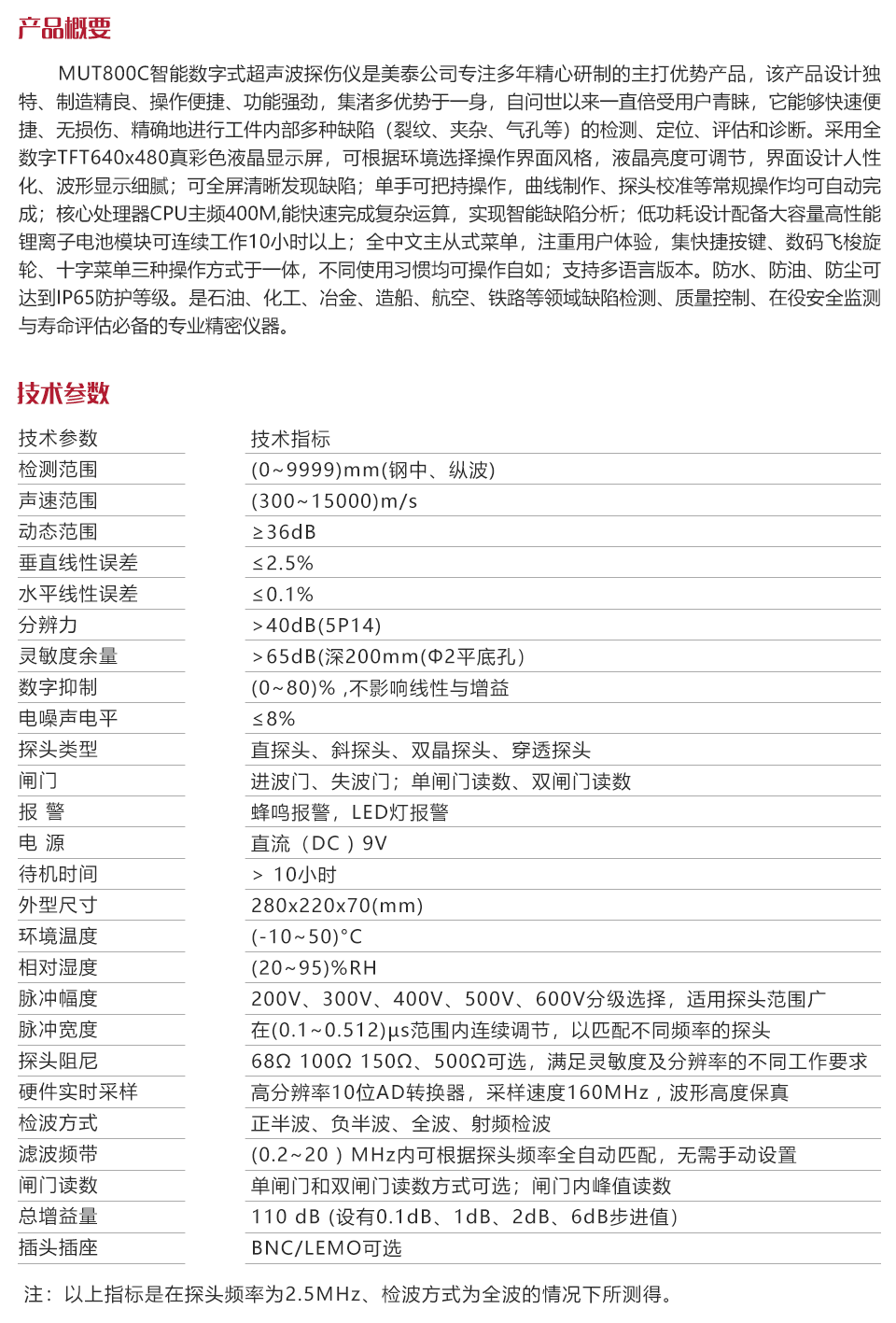 產(chǎn)品概述MUT800C智能數(shù)字式超聲波探傷儀是美泰公司專注多年精心研制的主打優(yōu)勢(shì)產(chǎn)品,該產(chǎn)品設(shè)計(jì)獨(dú)特、制造精良、操作便捷、功能強(qiáng)勁,集諸多優(yōu)勢(shì)于一身,自問世以來一直倍受用戶親睞,它能夠快速便捷、無損傷、精確地進(jìn)行工件內(nèi)部多種缺陷(裂紋、夾雜、氣孔等)的檢測(cè)、定位、評(píng)估和診斷。采用全數(shù)字TFT 640×480真彩色液晶顯示屏,可根據(jù)環(huán)境選擇操作界面風(fēng)格,液晶亮度可調(diào)節(jié),界面設(shè)計(jì)人性化、波形顯示細(xì)膩;可全屏清晰發(fā)現(xiàn)缺陷;單手可把持操作,曲線制作、探頭校準(zhǔn)等常規(guī)操作均可自動(dòng)完成;核心處理器CPU主頻400M,能快速完成復(fù)雜運(yùn)算,實(shí)現(xiàn)智能缺陷分析;低功耗設(shè)計(jì)配備大容量高性能鋰離子電池模塊可連續(xù)工作10小時(shí)以上;全中文主從式菜單,注重用戶體驗(yàn),集快捷按鍵、數(shù)碼飛梭旋輪、十字菜單三種操作方式于一體,不同使用習(xí)慣均可操作自如;支持多語言版本。防水、防油、防塵可達(dá)到IP65防護(hù)等級(jí)。是石油、化工、冶金、造船、航空、鐵路等領(lǐng)域缺陷檢測(cè)、質(zhì)量控制、在役安全監(jiān)測(cè)與壽命評(píng)估必備的專業(yè)精密儀器。