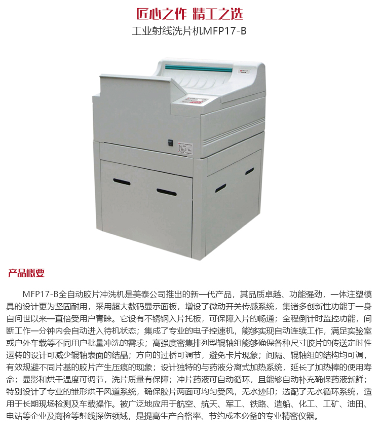 產(chǎn)品概述MFP17-B全自動膠片沖洗機是美泰公司推出的新一代產(chǎn)品,其品質(zhì)卓越、功能強勁,一體注塑模具的設(shè)計更為堅固耐用,采用超大數(shù)碼顯示面板,增設(shè)了微動開關(guān)傳感系統(tǒng),集諸多創(chuàng)新性功能于一身,自問世以來一直倍受用戶青睞。它設(shè)有不銹鋼入片托板,可保障入片的暢通;全程倒計時監(jiān)控功能,間斷工作一分鐘內(nèi)會自動進入待機狀態(tài);集成了專業(yè)的電子控速機,能夠?qū)崿F(xiàn)自動連續(xù)工作,滿足實驗室或戶外車載等不同用戶批量沖洗的需求;高強度密集排列型輥軸組能夠確保各種尺寸膠片的傳送;定時性運轉(zhuǎn)的設(shè)計可減少輥軸表面的結(jié)晶;方向的過橋可調(diào)節(jié),避免卡片現(xiàn)象;間隔、輥軸組的結(jié)構(gòu)均可調(diào),有效規(guī)避不同片基的膠片產(chǎn)生壓痕的現(xiàn)象;設(shè)計獨特的與藥液分離式加熱系統(tǒng),延長了加熱棒的使用壽命;顯影和烘干溫度可調(diào)節(jié),洗片質(zhì)量有保障;沖片藥液可自動循環(huán),且能夠自動補充,確保藥液新鮮;特別設(shè)計了專業(yè)的雛形烘干風道系統(tǒng),確保膠片兩面可均勻受風,無水跡印;選配了無水循環(huán)系統(tǒng),適用于長期現(xiàn)場檢測及車載操作。被廣泛地應(yīng)用于航空、航天、軍工、鐵路、造船、化工、工礦、油田、電站等企業(yè)及商檢等射線探傷領(lǐng)域,是提高生產(chǎn)合格率、節(jié)約成本必備的專業(yè)精密儀器。