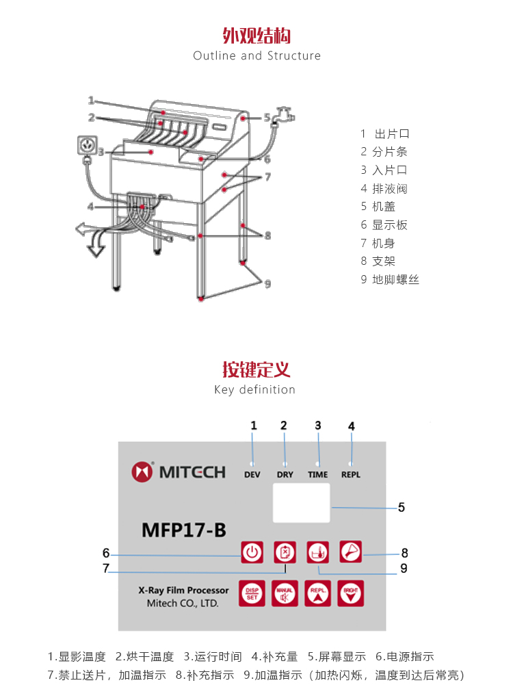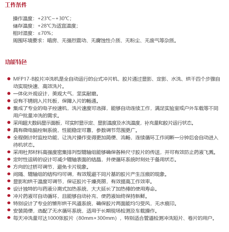 功能用途MFP17-B膠片沖洗機是全自動運行的臺式?jīng)_片機,膠片通過顯影、定影、水洗、烘干四個步驟自動實現(xiàn)快速、高效洗片。