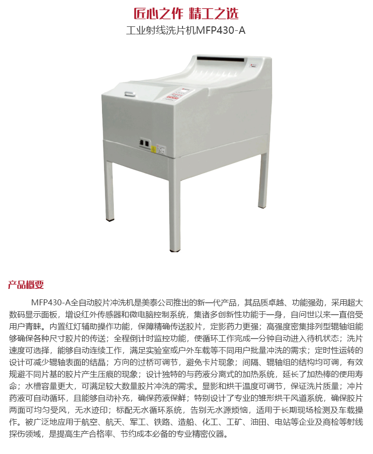 產(chǎn)品概述MFP430-A全自動(dòng)膠片沖洗機(jī)是美泰公司推出的新一代產(chǎn)品,其品質(zhì)卓越、功能強(qiáng)勁,采用超大數(shù)碼顯示面板,增設(shè)紅外傳感器和微電腦控制系統(tǒng),集諸多創(chuàng)新性功能于一身,自問(wèn)世以來(lái)一直倍受用戶青睞。內(nèi)置紅燈輔助操作功能,保障精確傳送膠片,定影藥力更強(qiáng);高強(qiáng)度密集排列型輥軸組能夠確保各種尺寸膠片的傳送;全程倒計(jì)時(shí)監(jiān)控功能,使循環(huán)工作完成一分鐘自動(dòng)進(jìn)入待機(jī)狀態(tài);洗片速度可選擇,能夠自動(dòng)連續(xù)工作,滿足實(shí)驗(yàn)室或戶外車載等不同用戶批量沖洗的需求;定時(shí)性運(yùn)轉(zhuǎn)的設(shè)計(jì)可減少輥軸表面的結(jié)晶;方向的過(guò)橋可調(diào)節(jié),避免卡片現(xiàn)象;間隔、輥軸組的結(jié)構(gòu)均可調(diào),有效規(guī)避不同片基的膠片產(chǎn)生壓痕的現(xiàn)象;設(shè)計(jì)獨(dú)特的與藥液分離式的加熱系統(tǒng),延長(zhǎng)了加熱棒的使用壽命;水槽容量更大,可滿足較大數(shù)量膠片沖洗的需求。顯影和烘干溫度可調(diào)節(jié),保證洗片質(zhì)量;沖片藥液可自動(dòng)循環(huán),且能夠自動(dòng)補(bǔ)充,確保藥液保鮮;特別設(shè)計(jì)了專業(yè)的雛形烘干風(fēng)道系統(tǒng),確保膠片兩面可均勻受風(fēng),無(wú)水跡??;標(biāo)配無(wú)水循環(huán)系統(tǒng),告別無(wú)水源煩惱,適用于長(zhǎng)期現(xiàn)場(chǎng)檢測(cè)及車載操作。被廣泛地應(yīng)用于航空、航天、軍工、鐵路、造船、化工、工礦、油田、電站等企業(yè)及商檢等射線探傷領(lǐng)域,是提高生產(chǎn)合格率、節(jié)約成本必備的專業(yè)精密儀器。