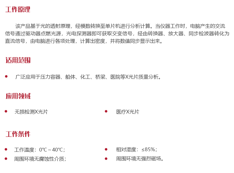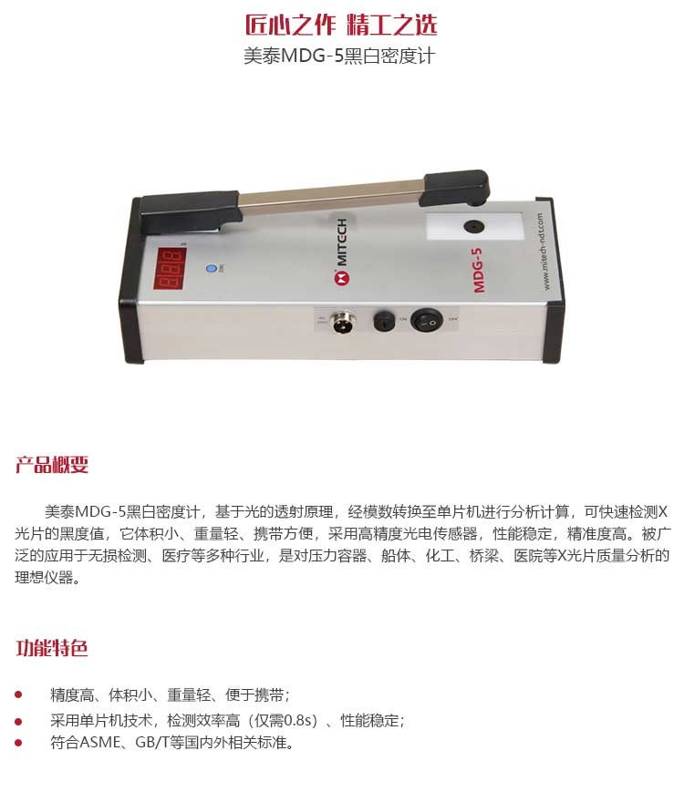 產(chǎn)品概述美泰MDG-5黑白密度計(jì),基于光的透射原理,經(jīng)模數(shù)轉(zhuǎn)換至單片機(jī)進(jìn)行分析計(jì)算,可快速檢測(cè)X光片的黑度值,它體積小、重量輕、攜帶方便,采用高精度光電傳感器,性能穩(wěn)定,精準(zhǔn)度高。被廣泛的應(yīng)用于無損檢測(cè)、醫(yī)療等多種行業(yè),是對(duì)壓力容器、船體、化工、橋梁、醫(yī)院等X光片質(zhì)量分析的理想儀器。