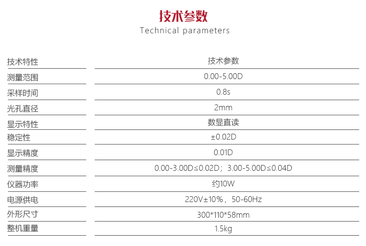 | 測(cè)量精度 | 0.00-3.00D≤0.02D;3.00-5.00D≤0.04D |