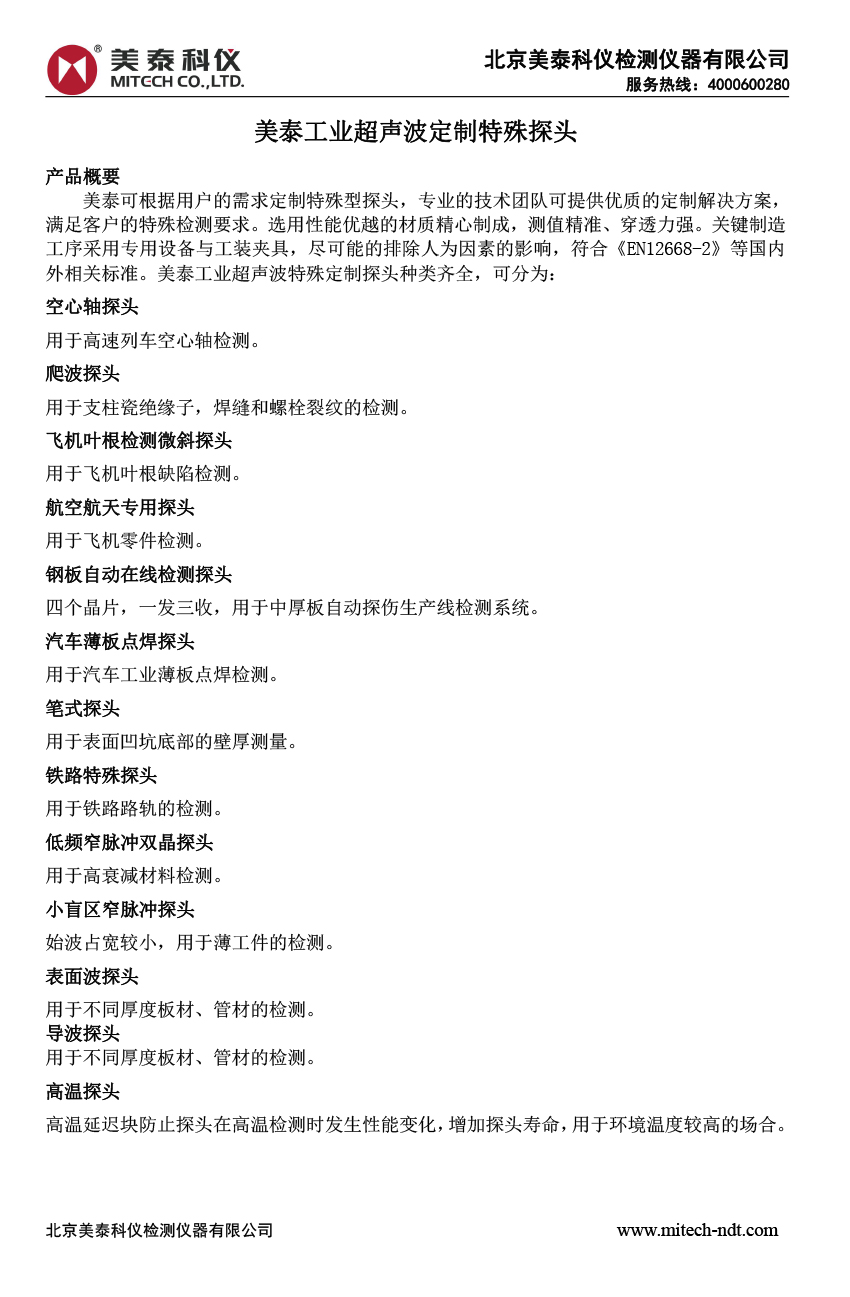 產(chǎn)品概述美泰可根據(jù)用戶的需求定制特殊型探頭,專業(yè)的技術(shù)團(tuán)隊(duì)可提供優(yōu)質(zhì)的定制解決方案,滿足客戶的特殊檢測(cè)要求。選用性能優(yōu)越的材質(zhì)精心制成,測(cè)值精準(zhǔn)、穿透力強(qiáng)。關(guān)鍵制造工序采用專用設(shè)備與工裝夾具,盡可能的排除人為因素的影響,符合《EN12668-2》等國(guó)內(nèi)外相關(guān)標(biāo)準(zhǔn)。