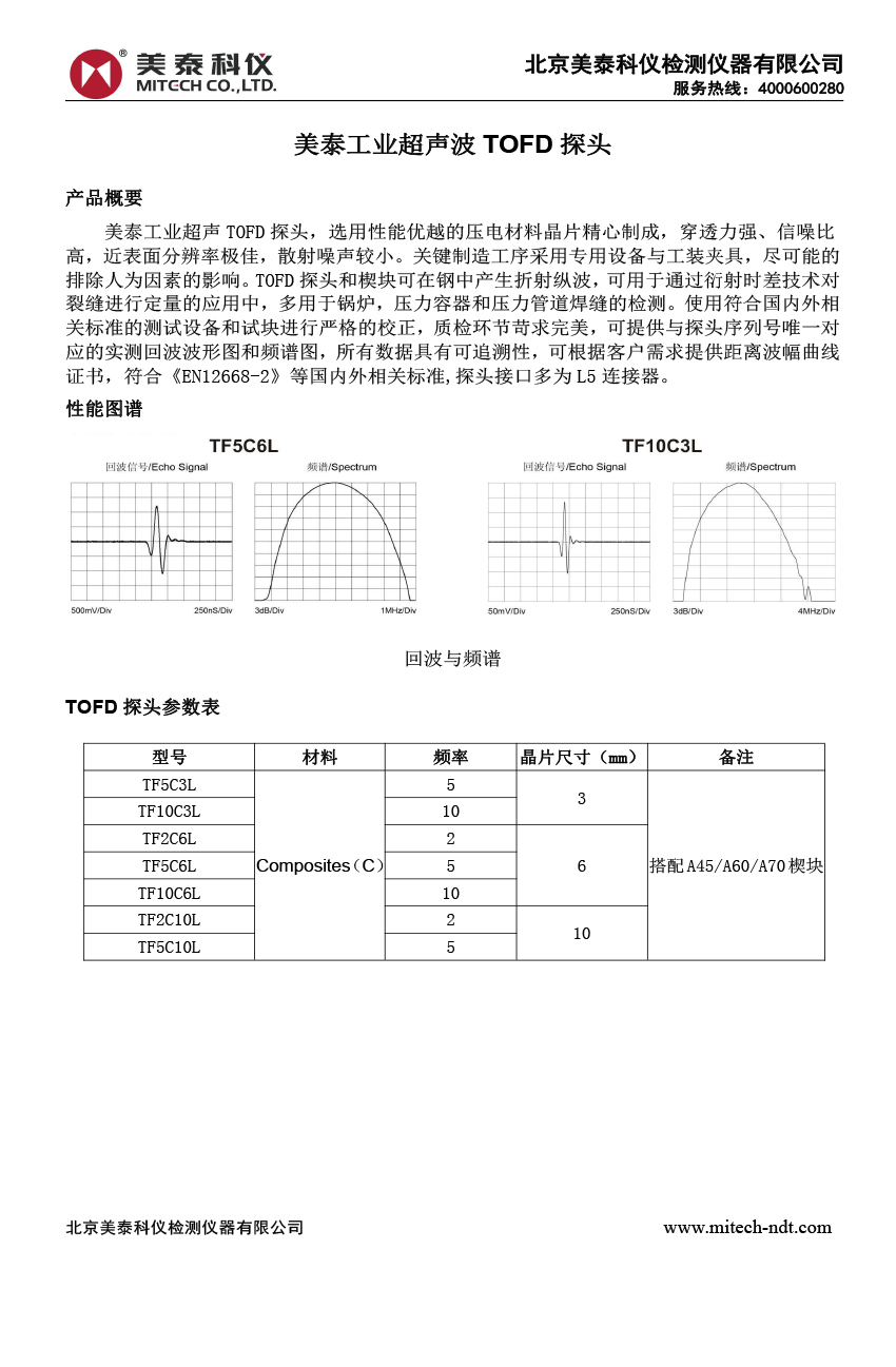 美泰工業(yè)超聲TOFD探頭,選用性能優(yōu)越的壓電材料晶片精心制成,穿透力強(qiáng)、信噪比高,近表面分辨率極佳,散射噪聲較小。關(guān)鍵制造工序采用專用設(shè)備與工裝夾具,盡可能的排除人為因素的影響。TOFD探頭和楔塊可在鋼中產(chǎn)生折射縱波,可用于通過衍射時(shí)差技術(shù)對(duì)裂縫進(jìn)行定量的應(yīng)用中,多用于鍋爐,壓力容器和壓力管道焊縫的檢測。使用符合國內(nèi)外相關(guān)標(biāo)準(zhǔn)的測試設(shè)備和試塊進(jìn)行嚴(yán)格的校正,質(zhì)檢環(huán)節(jié)苛求完美,可提供與探頭序列號(hào)唯一對(duì)應(yīng)的實(shí)測回波波形圖和頻譜圖,所有數(shù)據(jù)具有可追溯性,可根據(jù)客戶需求提供距離波幅曲線證書,符合《EN12668-2》等國內(nèi)外相關(guān)標(biāo)準(zhǔn),探頭接口多為L5連接器。