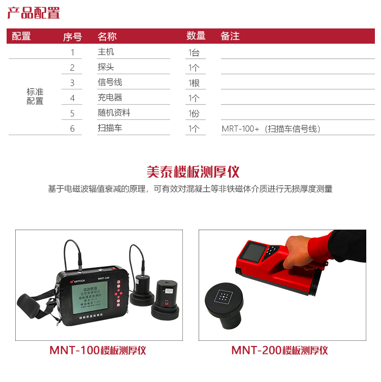 產(chǎn)品概述美泰MNT-100樓板測(cè)厚儀,基于電磁波幅值衰減的原理,可有效對(duì)混凝土等非鐵磁體介質(zhì)進(jìn)行無(wú)損厚度測(cè)量。其體積小、重量輕,易于攜帶,使用時(shí),將發(fā)射探頭和接收探頭分別置于被測(cè)物體的兩相對(duì)測(cè)試面,依據(jù)接收信號(hào),即刻測(cè)出厚度值。其測(cè)值速度快、測(cè)量精度高、性能穩(wěn)定可靠,被廣泛應(yīng)用于建筑施工質(zhì)量監(jiān)控檢測(cè)等領(lǐng)域,是保障生命財(cái)產(chǎn)安全必備的專業(yè)精密檢測(cè)儀器。
