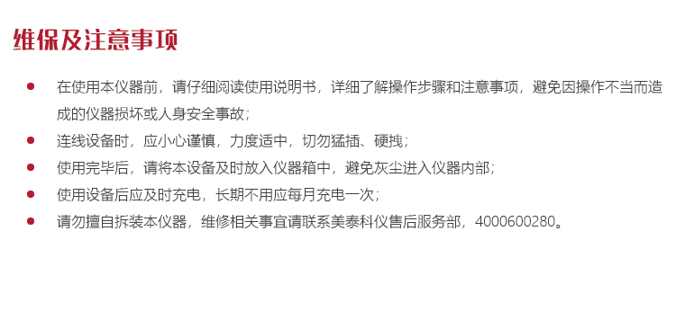 l 請(qǐng)勿擅自拆裝本儀器,維修相關(guān)事宜請(qǐng)聯(lián)系美泰科儀售后服務(wù)部,4000600280。