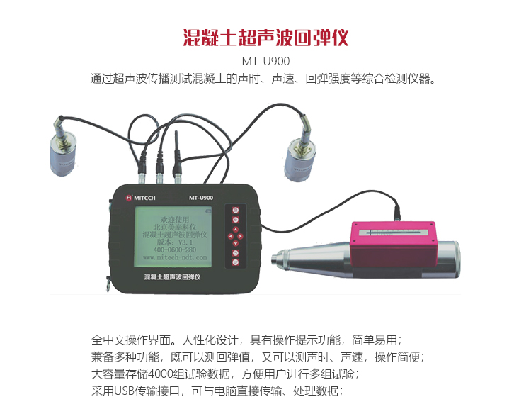 產(chǎn)品概述美泰MT-U900混凝土超聲波回彈儀,是一款功能強(qiáng)大的混凝土綜合檢測(cè)儀器。除具備普通回彈儀的強(qiáng)度測(cè)試功能外,可通過(guò)超聲波傳播測(cè)試混凝土的聲時(shí)、聲速等數(shù)值。其采用進(jìn)口傳感器及先進(jìn)的ARM處理器,測(cè)量快速準(zhǔn)確,適用于各類(lèi)建筑工程中普通混凝土抗壓強(qiáng)度的無(wú)損檢測(cè),是保障工程質(zhì)量、節(jié)約生產(chǎn)成本必備的精密檢測(cè)儀器。