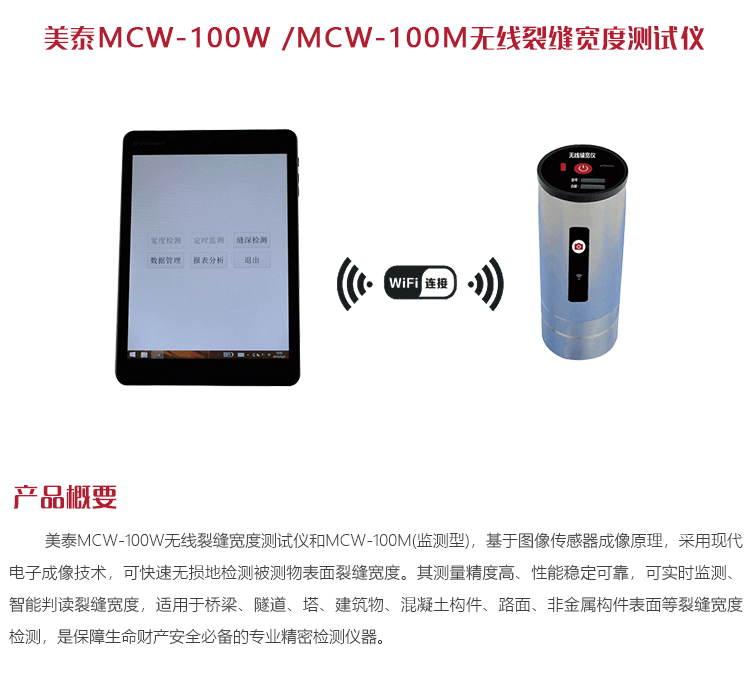 產(chǎn)品概述美泰MCW-100W無線裂縫寬度測試儀和MCW-100M(監(jiān)測型),基于圖像傳感器成像原理,采用現(xiàn)代電子成像技術(shù),可快速無損地檢測被測物表面裂縫寬度。其測量精度高、性能穩(wěn)定可靠,可實時監(jiān)測、智能判讀裂縫寬度,適用于橋梁、隧道、塔、建筑物、混凝土構(gòu)件、路面、非金屬構(gòu)件表面等裂縫寬度檢測,是保障生命財產(chǎn)安全必備的專業(yè)精密檢測儀器。