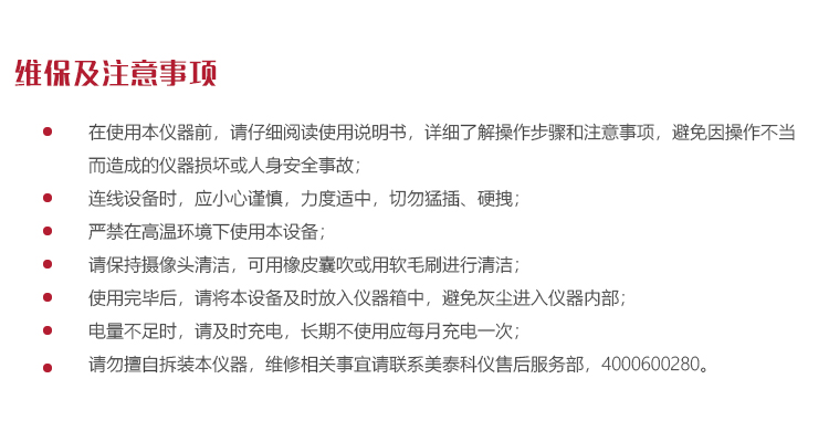 l 請勿擅自拆裝本儀器,維修相關(guān)事宜請聯(lián)系美泰科儀售后服務(wù)部,4000600280。